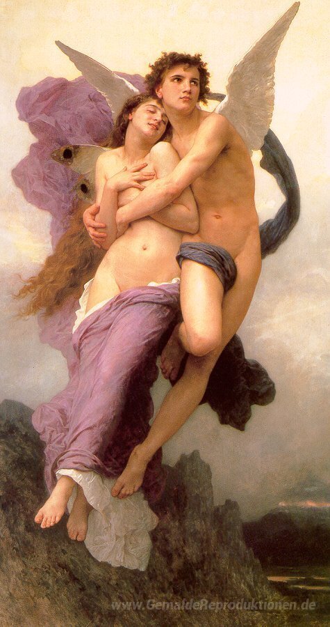Wir bieten Ihnen eine handgefertigte Reproduktion auf Leinwand des berühmten Kunstwerks 'Die Entführung der Psyche' von William-Adolphe Bouguereau, aus dem Reproduktionsmuseum.