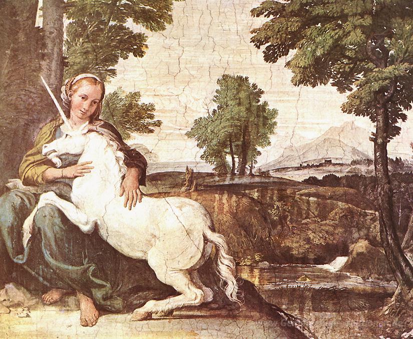 Wir bieten Ihnen eine handgefertigte Reproduktion auf Leinwand des berühmten Kunstwerks 'Die Jungfrau und das Einhorn (A Virgin mit einem Einhorn)' von Annibale Carracci, aus dem Reproduktionsmuseum.
