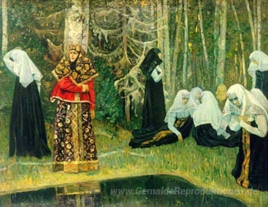 Wir bieten Ihnen eine handgefertigte Reproduktion auf Leinwand des berühmten Kunstwerks 'Die Legende von der unsichtbaren Stadt Kitesch' von Mikhail Nesterov, aus dem Reproduktionsmuseum.