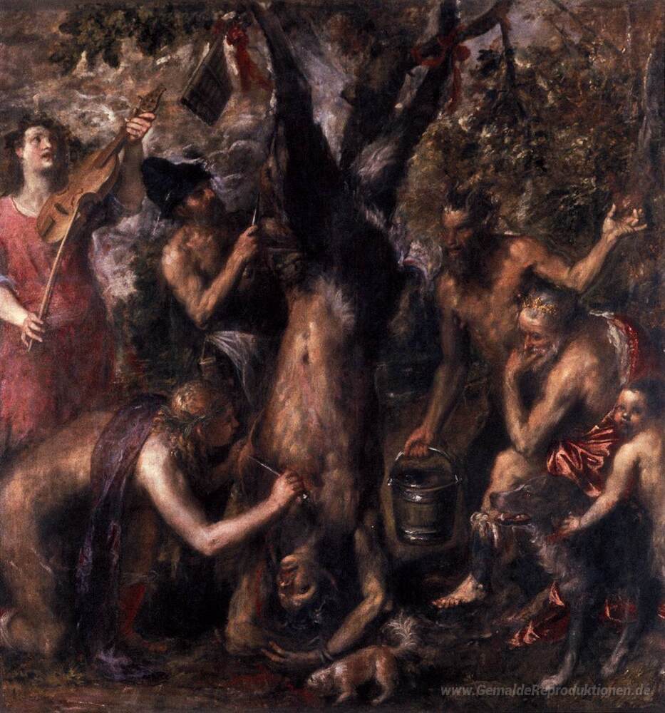 Wir bieten Ihnen eine handgefertigte Reproduktion auf Leinwand des berühmten Kunstwerks 'Die Schindung des Marsyas' von Titian, aus dem Reproduktionsmuseum.