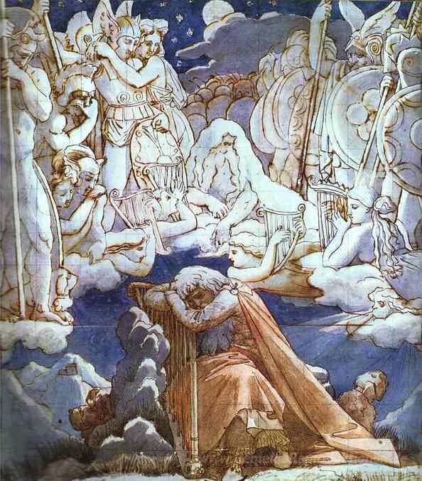 Wir bieten Ihnen eine handgefertigte Reproduktion auf Leinwand des berühmten Kunstwerks 'Die Songs of Ossian' von Jean Auguste Dominique Ingres, aus dem Reproduktionsmuseum.