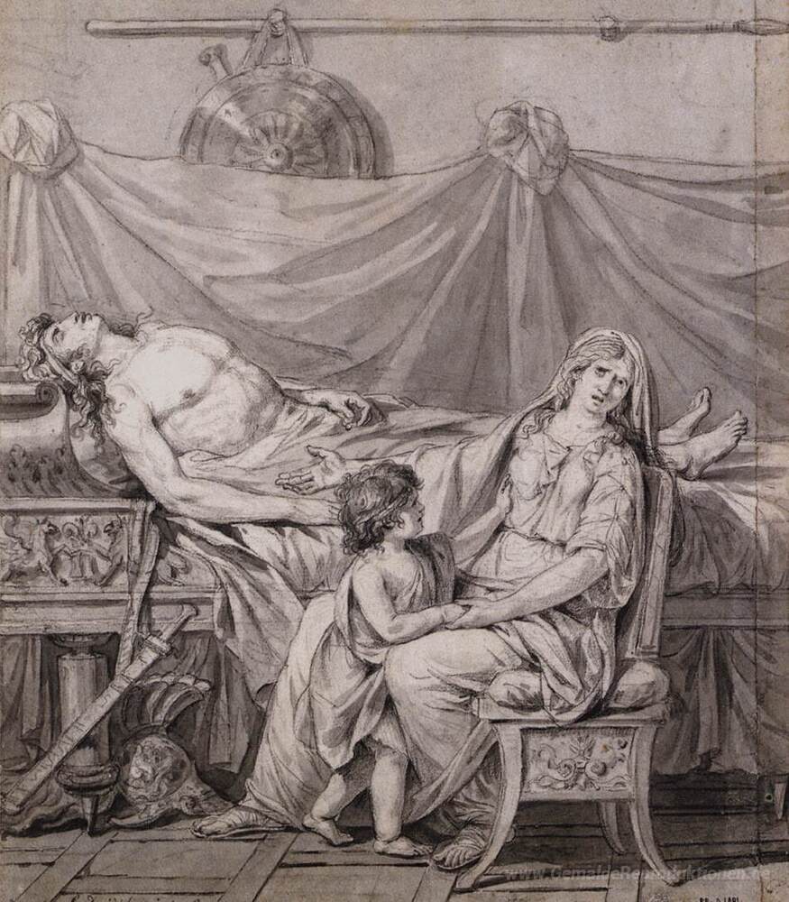 Wir bieten Ihnen eine handgefertigte Reproduktion auf Leinwand des berühmten Kunstwerks 'Die Trauer der Andromache' von Jacques-Louis David, aus dem Reproduktionsmuseum.