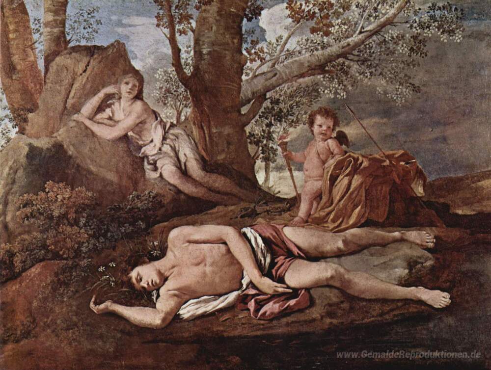 Wir bieten Ihnen eine handgefertigte Reproduktion auf Leinwand des berühmten Kunstwerks 'Echo und Narcissus' von Nicolas Poussin, aus dem Reproduktionsmuseum.