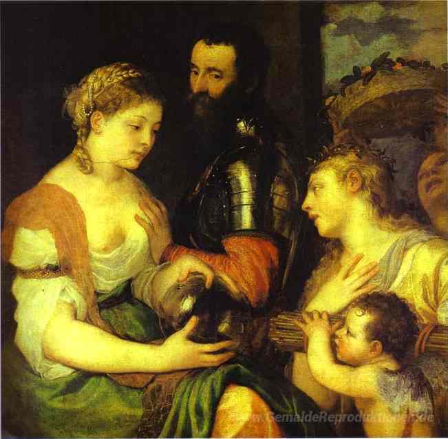 Wir bieten Ihnen eine handgefertigte Reproduktion auf Leinwand des berühmten Kunstwerks 'Ehe mit Vesta und Hymen als Beschützer und Berater der Union von' von Titian, aus dem Reproduktionsmuseum.