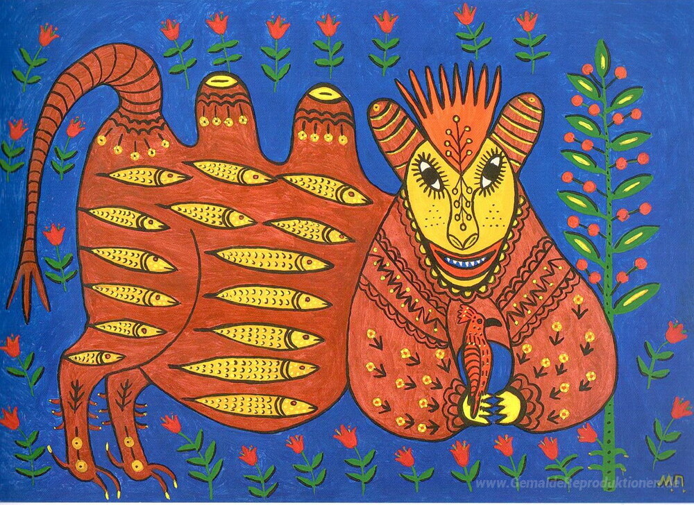 Wir bieten Ihnen eine handgefertigte Reproduktion auf Leinwand des berühmten Kunstwerks 'Ein Fisch König gefangen hat ein Wiedehopf und ist voll von Freu' von Maria Primachenko, aus dem Reproduktionsmuseum.