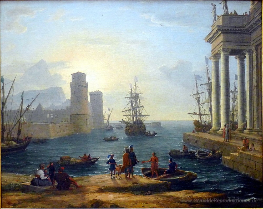 Wir bieten Ihnen eine handgefertigte Reproduktion auf Leinwand des berühmten Kunstwerks 'Einschiffung des Odysseus' von Claude Lorrain, aus dem Reproduktionsmuseum.
