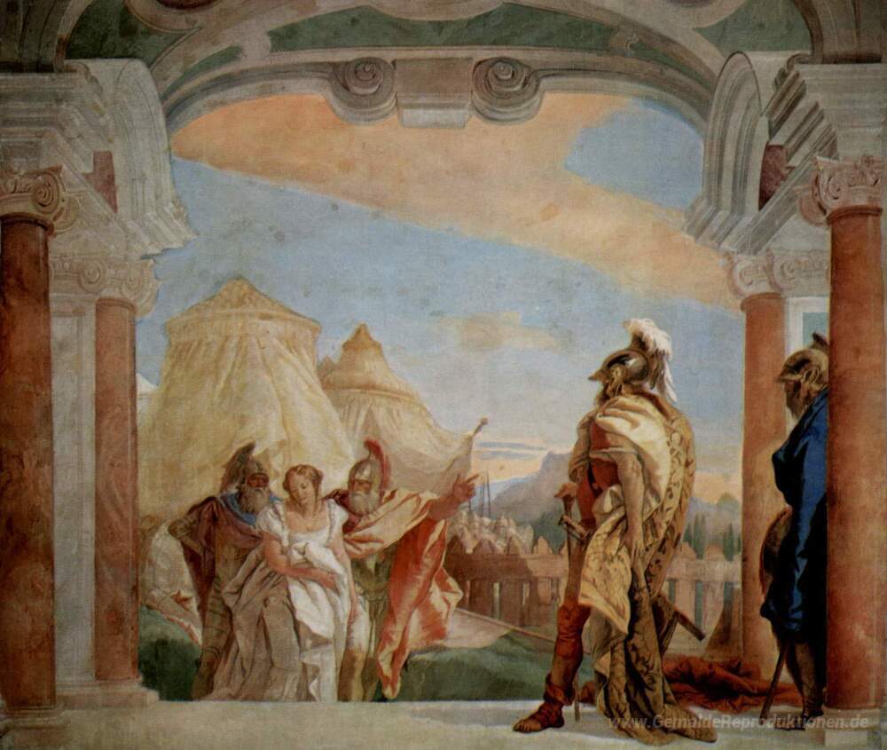 Wir bieten Ihnen eine handgefertigte Reproduktion auf Leinwand des berühmten Kunstwerks 'Eurybates und Talthybios Blei Briseis zu Agamemmon' von Giovanni Battista Tiepolo, aus dem Reproduktionsmuseum.