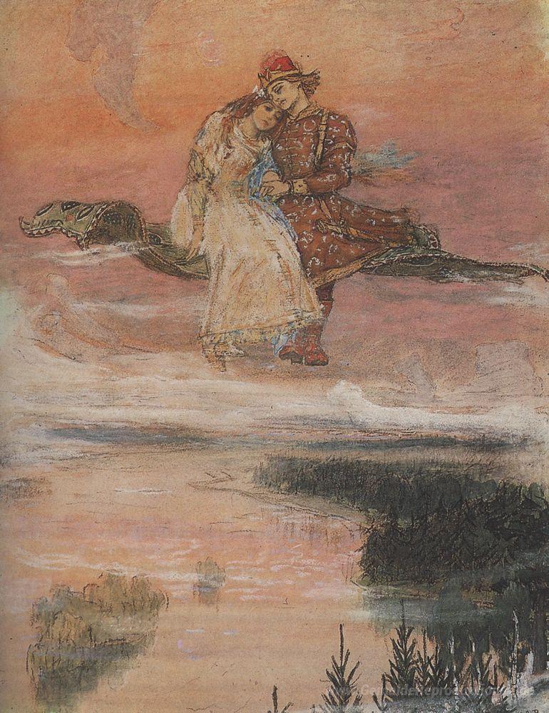 Wir bieten Ihnen eine handgefertigte Reproduktion auf Leinwand des berühmten Kunstwerks 'Fliegenden Teppich' von Viktor Vasnetsov, aus dem Reproduktionsmuseum.