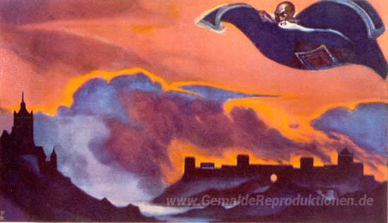 Wir bieten Ihnen eine handgefertigte Reproduktion auf Leinwand des berühmten Kunstwerks 'Flying Carpet' von Nicholas Roerich, aus dem Reproduktionsmuseum.