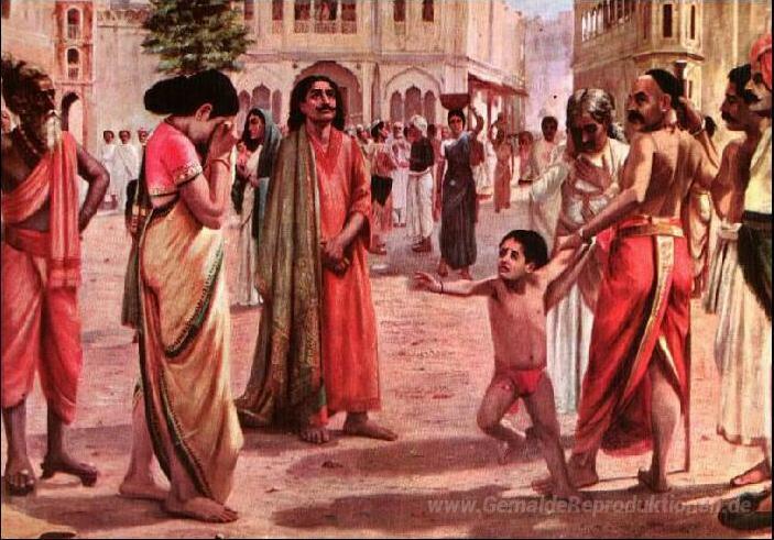 Wir bieten Ihnen eine handgefertigte Reproduktion auf Leinwand des berühmten Kunstwerks 'Harischandra in Not, mit dem Reich Gottes und den ganzen Reichtu' von Raja Ravi Varma, aus dem Reproduktionsmuseum.