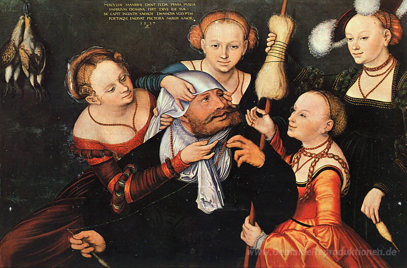 Wir bieten Ihnen eine handgefertigte Reproduktion auf Leinwand des berühmten Kunstwerks 'Herakles und Omphale' von Lucas Cranach the Elder, aus dem Reproduktionsmuseum.