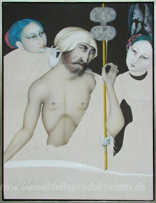 Wir bieten Ihnen eine handgefertigte Reproduktion auf Leinwand des berühmten Kunstwerks 'Hercules unter Weiblich Influence' von Paul Wunderlich, aus dem Reproduktionsmuseum.