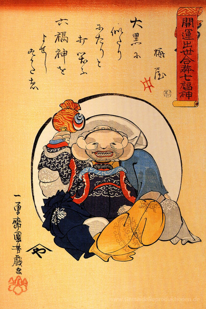 Wir bieten Ihnen eine handgefertigte Reproduktion auf Leinwand des berühmten Kunstwerks 'Hotei' von Utagawa Kuniyoshi, aus dem Reproduktionsmuseum.