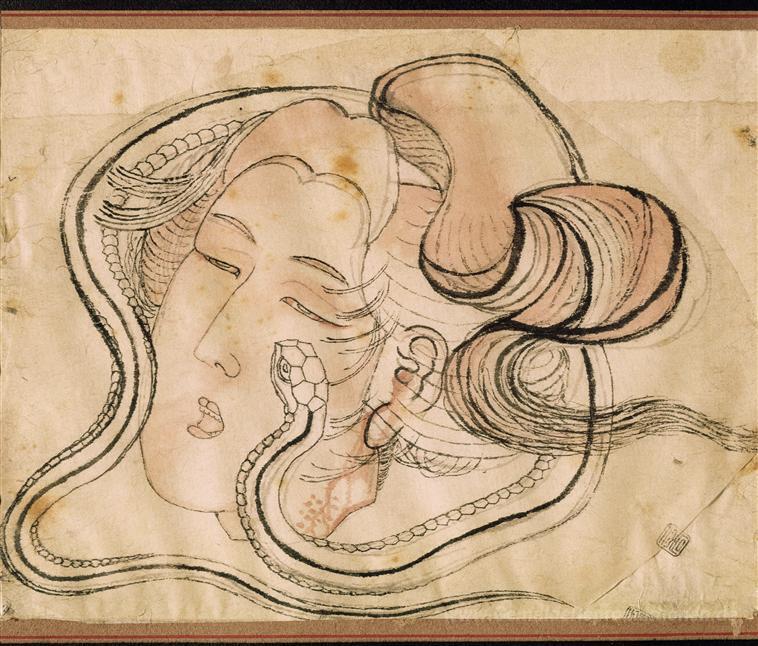 Wir bieten Ihnen eine handgefertigte Reproduktion auf Leinwand des berühmten Kunstwerks 'Leiter der Schlangenfrau' von Katsushika Hokusai, aus dem Reproduktionsmuseum.