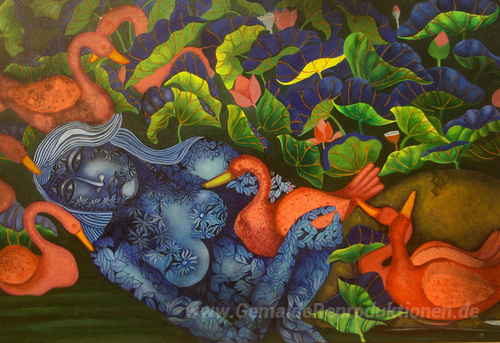 Wir bieten Ihnen eine handgefertigte Reproduktion auf Leinwand des berühmten Kunstwerks 'Meerjungfrau im Lotus-Teich I' von Jahar Dasgupta, aus dem Reproduktionsmuseum.