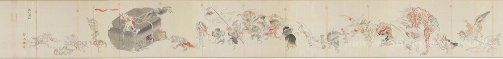 Willkommen in unserer exquisiten Kollektion von Ölgemälden, in der Kunst und Eleganz aufeinandertreffen. Entdecken Sie das Meisterwerk Nachtmarsch von ein hundert Dämonen (linke Hälfte), geschaffen von dem renommierten Künstler Tosa Mitsuoki. Dieser herausragende japanische Maler des 17. Jahrhunderts verbindet traditionelle Techniken mit einer faszinierenden Erzählweise, die den Betrachter in eine andere Welt entführt.