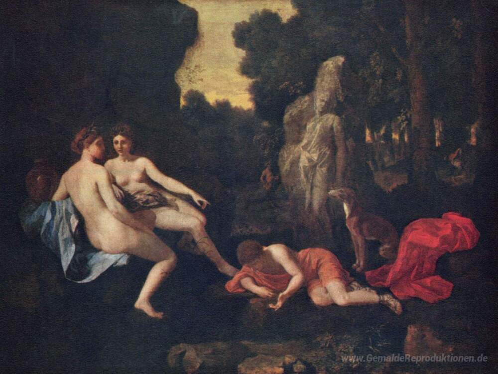 Wir bieten Ihnen eine handgefertigte Reproduktion auf Leinwand des berühmten Kunstwerks 'Narcissus und Echo' von Nicolas Poussin, aus dem Reproduktionsmuseum.