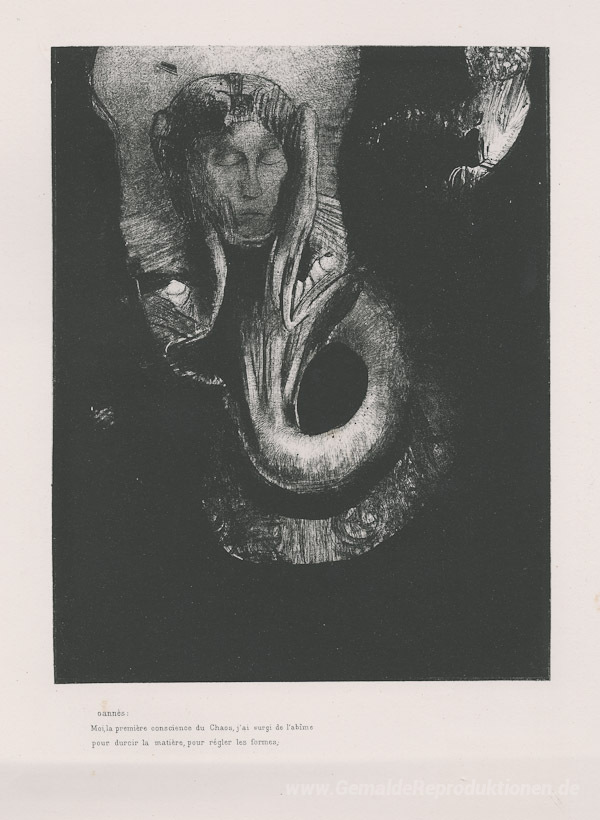 Wir bieten Ihnen eine handgefertigte Reproduktion auf Leinwand des berühmten Kunstwerks 'Oannes: I, das erste Bewußtsein des Chaos, entstanden aus dem Ab' von Odilon Redon, aus dem Reproduktionsmuseum.