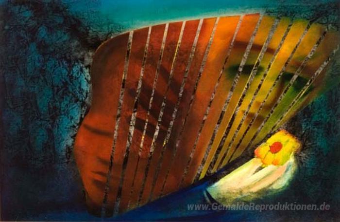 Wir bieten Ihnen eine handgefertigte Reproduktion auf Leinwand des berühmten Kunstwerks 'Orpheus. The Harp of Love' von Charles Blackman, aus dem Reproduktionsmuseum.
