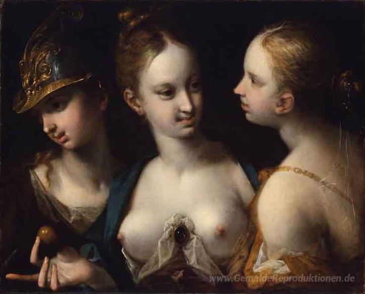 Wir bieten Ihnen eine handgefertigte Reproduktion auf Leinwand des berühmten Kunstwerks 'Pallas Athene, Venus und Juno' von Hans von Aachen, aus dem Reproduktionsmuseum.