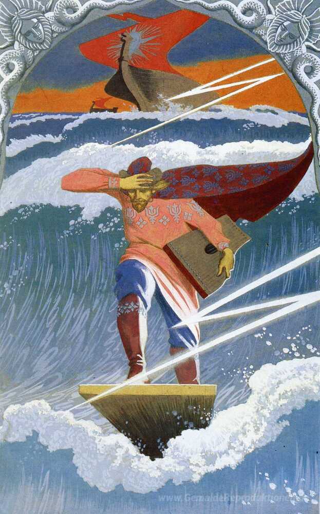 Wir bieten Ihnen eine handgefertigte Reproduktion auf Leinwand des berühmten Kunstwerks 'Sadko im Zypressen Planke' von Konstantin Vasilyev, aus dem Reproduktionsmuseum.