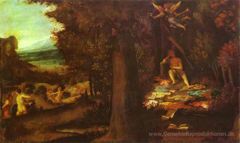 Wir bieten Ihnen eine handgefertigte Reproduktion auf Leinwand des berühmten Kunstwerks 'Sleeping Apollo, Musen und Fama' von Lorenzo Lotto, aus dem Reproduktionsmuseum.