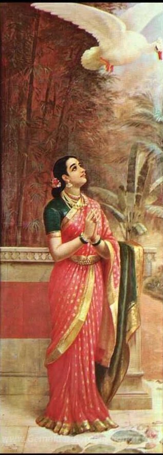 Wir bieten Ihnen eine handgefertigte Reproduktion auf Leinwand des berühmten Kunstwerks 'Swan Messenger' von Raja Ravi Varma, aus dem Reproduktionsmuseum.