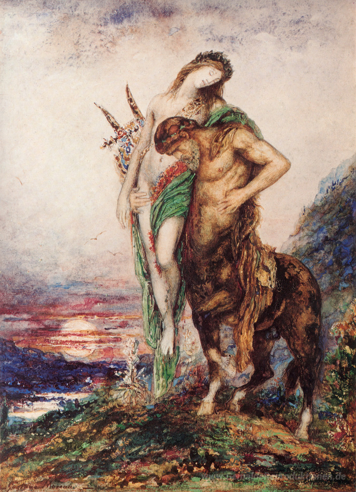 Wir bieten Ihnen eine handgefertigte Reproduktion auf Leinwand des berühmten Kunstwerks 'Tote Dichter Zentaur getragen' von Gustave Moreau, aus dem Reproduktionsmuseum.