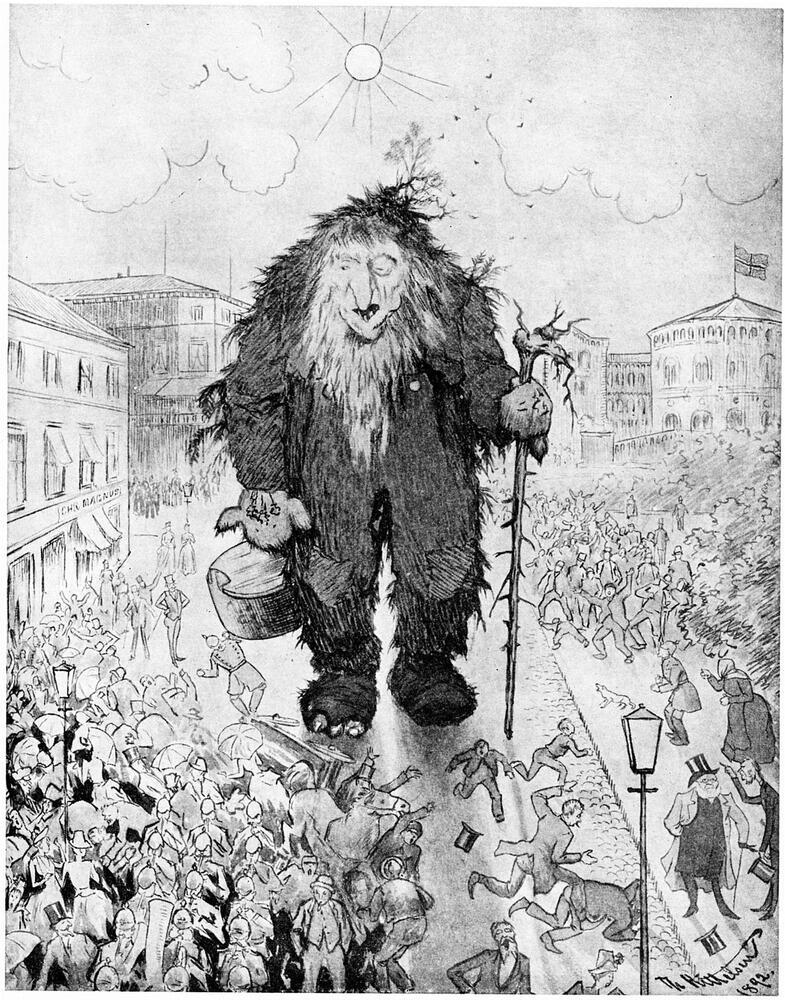 Willkommen in der faszinierenden Welt der Ölgemälde, in der Kunst und Emotionen in harmonischer Symbiose verschmelzen. Entdecken Sie das zeitlose Werk Troll an der Karl Johans Gate - Trollet på Karl Johan, geschaffen von dem talentierten norwegischen Künstler Theodor Severin Kittelsen. Kittelsen, bekannt für seine tiefgründige Darstellung von Folklore und Natur, schafft mit seinem expressive Stil eine magische Atmosphäre, die den Betrachter in ihren Bann zieht.