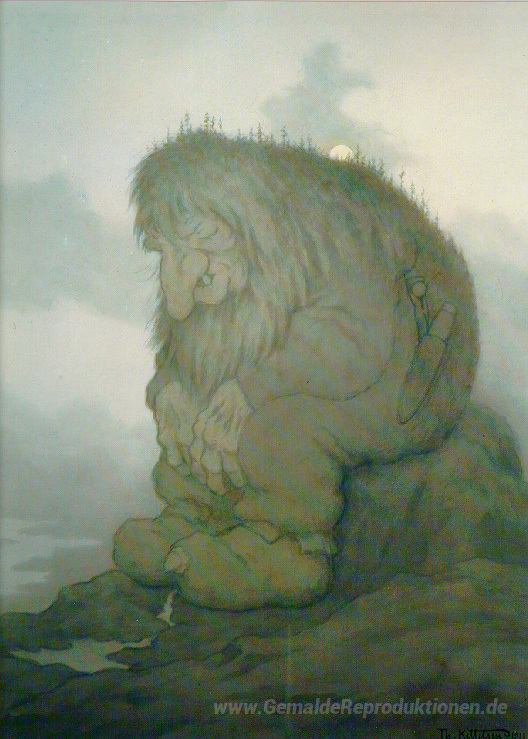 Wir bieten Ihnen eine handgefertigte Reproduktion auf Leinwand des berühmten Kunstwerks 'Troll Wunder wie alt er ist - Trollet som Grunner på hvor Gammel' von Theodor Severin Kittelsen, aus dem Reproduktionsmuseum.