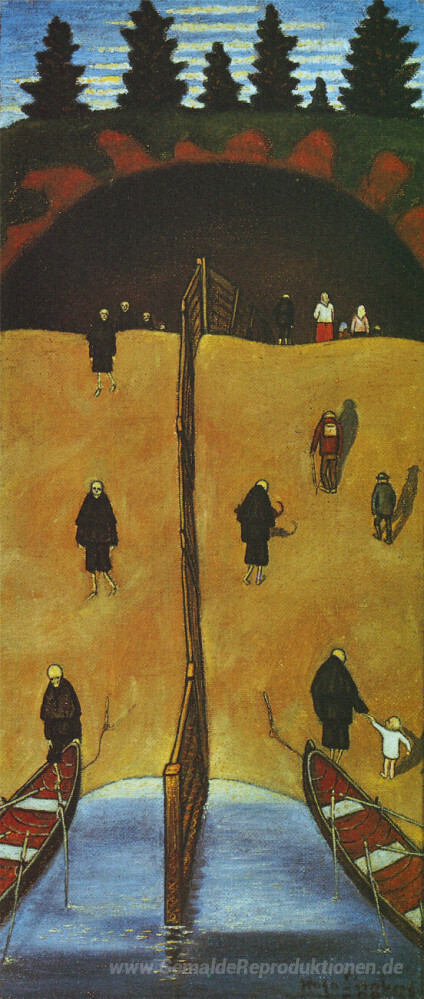 Wir bieten Ihnen eine handgefertigte Reproduktion auf Leinwand des berühmten Kunstwerks 'Tuonelan Portilla' von Hugo Simberg, aus dem Reproduktionsmuseum.