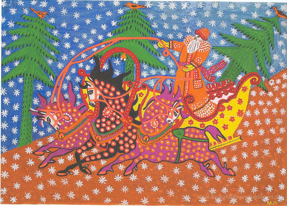 Wir bieten Ihnen eine handgefertigte Reproduktion auf Leinwand des berühmten Kunstwerks 'Väterchen Frost trägt den neuen Jahr Baum' von Maria Primachenko, aus dem Reproduktionsmuseum.
