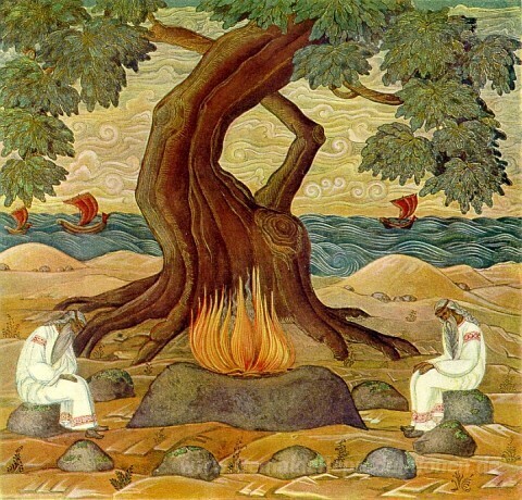 Wir bieten Ihnen eine handgefertigte Reproduktion auf Leinwand des berühmten Kunstwerks 'Vaydelots' von Nicholas Roerich, aus dem Reproduktionsmuseum.