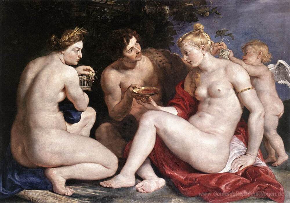 Wir bieten Ihnen eine handgefertigte Reproduktion auf Leinwand des berühmten Kunstwerks 'Venus, Amor, Bacchus und Ceres' von Peter Paul Rubens, aus dem Reproduktionsmuseum.