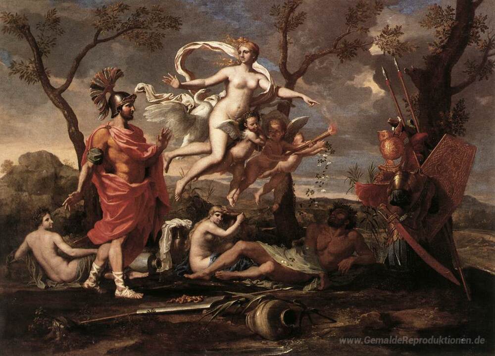 Wir bieten Ihnen eine handgefertigte Reproduktion auf Leinwand des berühmten Kunstwerks 'Venus Presenting Arms auf Aeneas' von Nicolas Poussin, aus dem Reproduktionsmuseum.