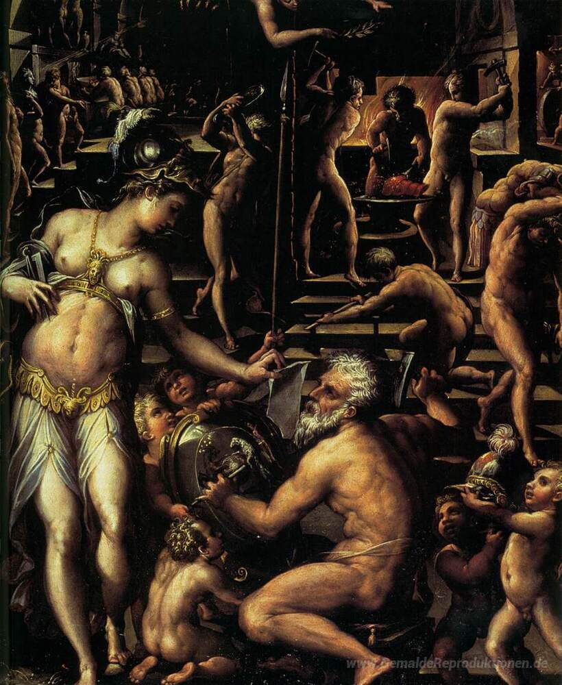 Wir bieten Ihnen eine handgefertigte Reproduktion auf Leinwand des berühmten Kunstwerks 'Vulcan Schmiede' von Giorgio Vasari, aus dem Reproduktionsmuseum.