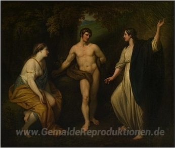 Wir bieten Ihnen eine handgefertigte Reproduktion auf Leinwand des berühmten Kunstwerks 'Wahl des Herkules zwischen Tugend und Vergnügen' von Benjamin West, aus dem Reproduktionsmuseum.