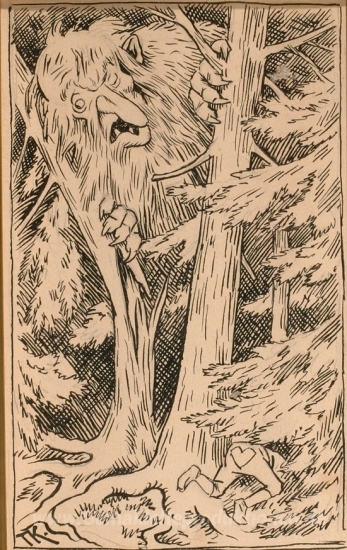 Wir bieten Ihnen eine handgefertigte Reproduktion auf Leinwand des berühmten Kunstwerks 'Wald Troll - Skogtroll' von Theodor Severin Kittelsen, aus dem Reproduktionsmuseum.