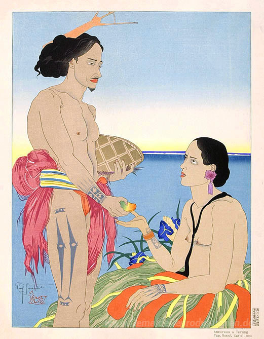 Wir bieten Ihnen eine handgefertigte Reproduktion auf Leinwand des berühmten Kunstwerks 'Amoreux A Tarang Yap. Ouest Carolines' von Paul Jacoulet, aus dem Reproduktionsmuseum.