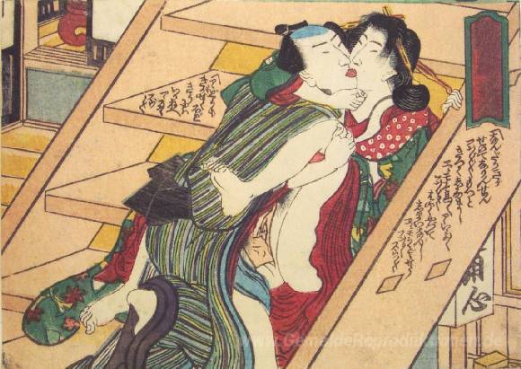 Wir bieten Ihnen eine handgefertigte Reproduktion auf Leinwand des berühmten Kunstwerks 'Auf der Treppe' von Utagawa Kunisada, aus dem Reproduktionsmuseum.