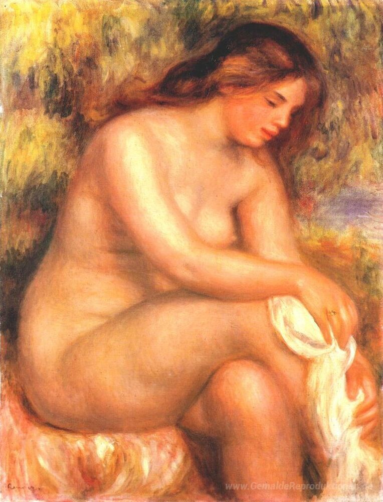 Willkommen in unserer exquisite Kollektion von Ölgemälden, in der Kunstwerke von renommierten Künstlern wie Pierre-Auguste Renoir zu finden sind. Das Meisterwerk Badende Trocknen ihr Bein verkörpert Renoirs einzigartigen Impressionismus, der die flüchtigen Momente des Lebens mit lebhaften Farben und dynamischen Pinselstrichen einfängt. Renoir, ein Meister der Lichtführung und des menschlichen Ausdrucks, verleiht seinen Bildern eine unverwechselbare Wärme und Intimität, die den Betrachter in eine harmonische Welt entführt.