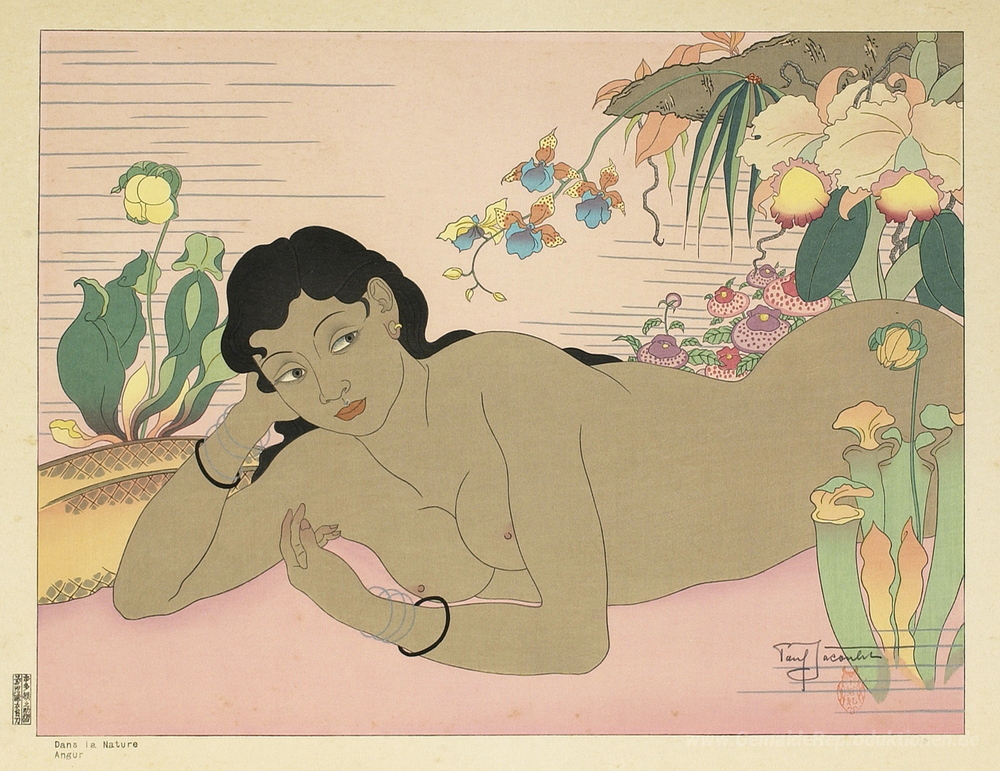 Wir bieten Ihnen eine handgefertigte Reproduktion auf Leinwand des berühmten Kunstwerks 'Dans La Nature, Angur' von Paul Jacoulet, aus dem Reproduktionsmuseum.
