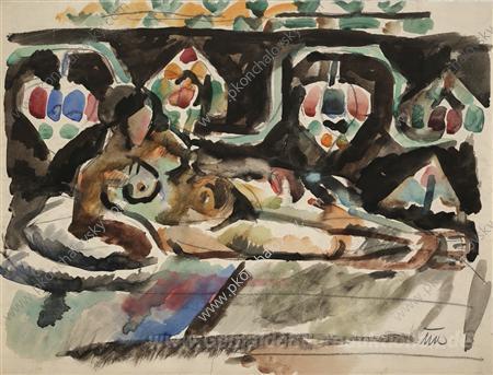 Wir bieten Ihnen eine handgefertigte Reproduktion auf Leinwand des berühmten Kunstwerks 'Das Modell auf dem Teppich' von Pyotr Konchalovsky, aus dem Reproduktionsmuseum.
