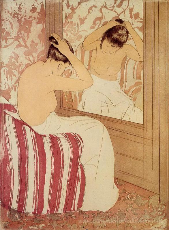 Wir bieten Ihnen eine handgefertigte Reproduktion auf Leinwand des berühmten Kunstwerks 'Der Coiffure Studie' von Mary Cassatt, aus dem Reproduktionsmuseum.