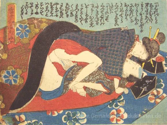 Wir bieten Ihnen eine handgefertigte Reproduktion auf Leinwand des berühmten Kunstwerks 'Die Rot-und Golddecke' von Utagawa Kunisada, aus dem Reproduktionsmuseum.