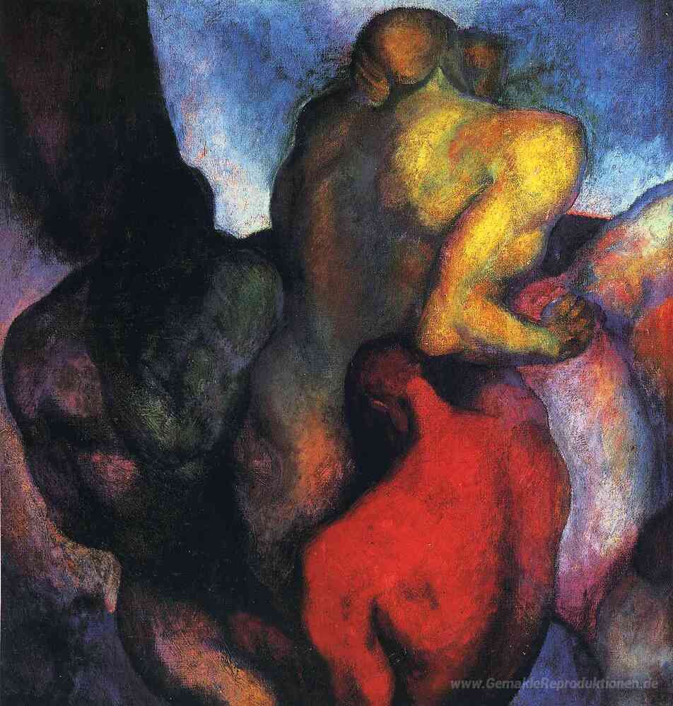 Wir bieten Ihnen eine handgefertigte Reproduktion auf Leinwand des berühmten Kunstwerks 'Drei Figuren' von Thomas Hart Benton, aus dem Reproduktionsmuseum.