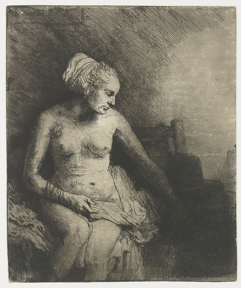 Wir bieten Ihnen eine handgefertigte Reproduktion auf Leinwand des berühmten Kunstwerks 'Eine Frau an der Badewanne mit einem Hut neben ihr' von Rembrandt, aus dem Reproduktionsmuseum.