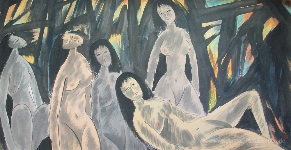 Wir bieten Ihnen eine handgefertigte Reproduktion auf Leinwand des berühmten Kunstwerks 'Fünf nackte Damen' von Lin Fengmian, aus dem Reproduktionsmuseum.