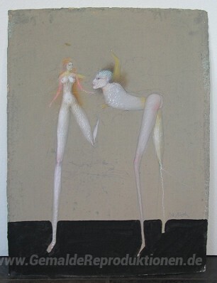 Wir bieten Ihnen eine handgefertigte Reproduktion auf Leinwand des berühmten Kunstwerks 'Flirt' von Paul Wunderlich, aus dem Reproduktionsmuseum.