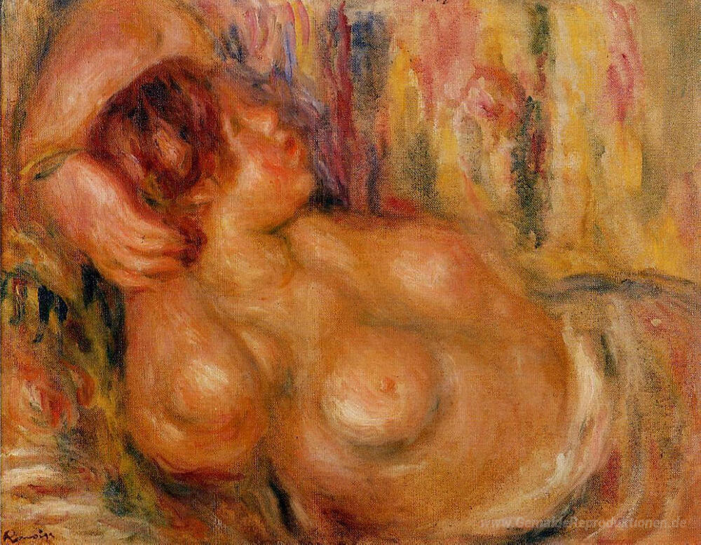 Wir bieten Ihnen eine handgefertigte Reproduktion auf Leinwand des berühmten Kunstwerks 'Frau auf der Brust' von Pierre-Auguste Renoir, aus dem Reproduktionsmuseum.